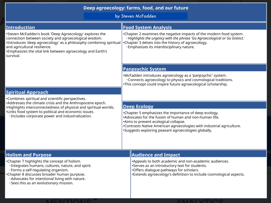 Through a critical analysis of modern agricultural practices and historical contexts, McFadden advocates for a shift towards sustainable agroecological methods, which he posits as essential for addressing ecological crises and fostering an intentional relationship with nature.